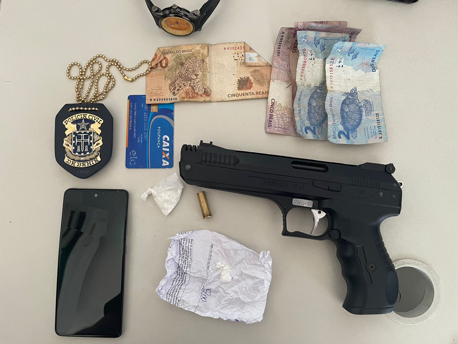 O suspeito S. T. C. R. recebeu a ordem de prisão após ter sido localizado em sua residência, na Rua Álvaro Augusto. Na ação, os agentes encontraram um simulacro de arma de fogo, duas trouxinhas de cocaína, R$ 69 em espécie e um estojo de munição calibre 38. O homem foi levado para a Delegacia Territorial (DT/Serrinha) e, em seguida, para o Departamento de Polícia Técnica (DPT) para a realização de perícia.