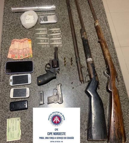 No local, também foram apreendidas duas espingardas de fabricação artesanal, um carregador, oito munições, 40 trouxinhas de cocaína, uma porção maior da mesma droga, quatro celulares e dinheiro.