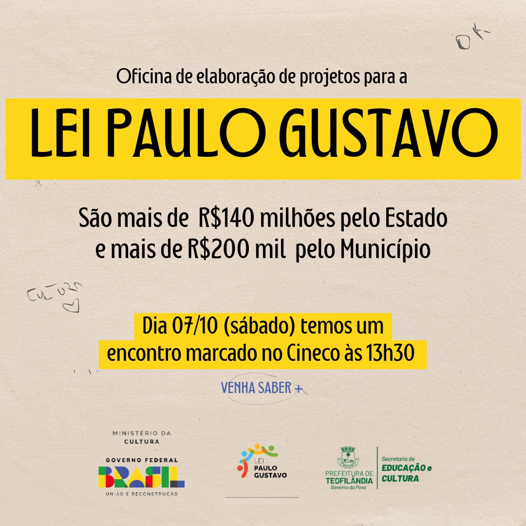 A Prefeitura de Teofilândia através da Secretaria Municipal de Educação e Cultura irá realizar mais um encontro para ministrar uma oficina sobre os editais da Lei Paulo Gustavo, que acontecerá novamente no Cineco, na Biblioteca Municipal de Teofilândia, no próximo sábado, 07, a partir das 13h30.