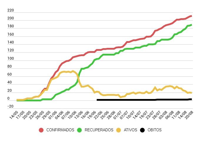 210 casos confirmados (dos quais 20 estão ativos);⠀⠀⠀⠀⠀